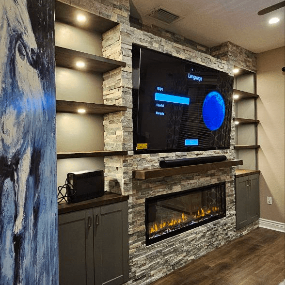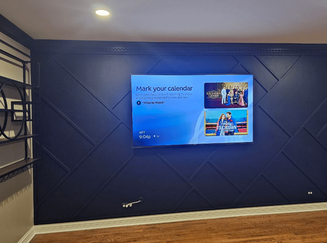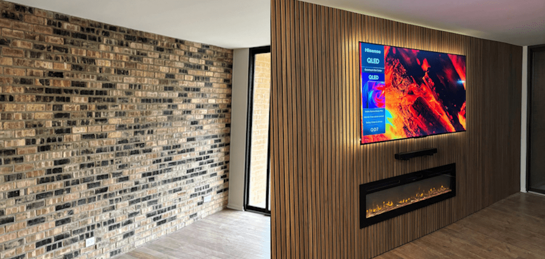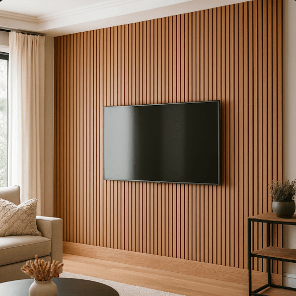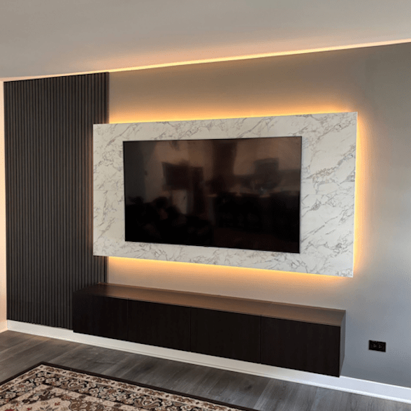 Includes custom layout design, TV mounting preparation, cable management channels, integrated lighting options, and installation of slat, wood, or decorative panel materials. Pricing varies based on materials, lighting complexity, and integrated shelving. Excludes major electrical rewiring or structural changes.